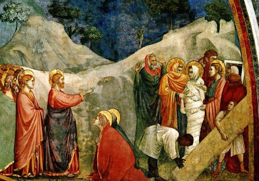 Był pewien chory, Łazarz z Betanii, ze wsi Marii i jej siostry, Marty. Maria zaś była tą, która namaściła Pana olejkiem i włosami swoimi otarła Jego nogi. Jej to brat, Łazarz, chorował. Siostry zatem posłały do Niego wiadomość: "Panie, oto choruje ten, którego Ty kochasz". Jezus, usłyszawszy to, rzekł: "Choroba ta nie zmierza ku śmierci, ale ku chwale Bożej, aby dzięki niej Syn Boży został otoczony chwałą". A Jezus miłował Martę i jej siostrę, i Łazarza. Gdy posłyszał o jego chorobie, pozostał przez dwa dni tam, gdzie przebywał. Dopiero potem powiedział do swoich uczniów: "Chodźmy znów do Judei". Rzekli do Niego uczniowie: "Rabbi, dopiero co Żydzi usiłowali Cię ukamienować i znów tam idziesz?" Jezus im odpowiedział: "Czyż dzień nie liczy dwunastu godzin? Jeśli ktoś chodzi za dnia, nie potyka się, ponieważ widzi światło tego świata. Jeżeli jednak ktoś chodzi w nocy, potknie się, ponieważ brak mu światła". To powiedział, a następnie rzekł do nich: "Łazarz, przyjaciel nasz, zasnął, lecz idę go obudzić". Uczniowie rzekli do Niego: "Panie, jeżeli zasnął, to wyzdrowieje". Jezus jednak mówił o jego śmierci, a im się wydawało, że mówi o zwyczajnym śnie. Wtedy Jezus powiedział im otwarcie: "Łazarz umarł, ale raduję się, że Mnie tam nie było, ze względu na was, abyście uwierzyli. Lecz chodźmy do niego". A Tomasz, zwany Didymos, rzekł do współuczniów: "Chodźmy także i my, aby razem z Nim umrzeć". Kiedy Jezus tam przybył, zastał Łazarza już od czterech dni spoczywającego w grobie. A Betania była oddalona od Jerozolimy około piętnastu stadiów. I wielu Żydów przybyło przedtem do Marty i Marii, aby je pocieszyć po utracie brata. Kiedy więc Marta dowiedziała się, że Jezus nadchodzi, wyszła Mu na spotkanie. Maria zaś siedziała w domu. Marta więc rzekła do Jezusa: "Panie, gdybyś tu był, mój brat by nie umarł. Lecz i teraz wiem, że Bóg da Ci wszystko, o cokolwiek byś prosił Boga". Rzekł do niej Jezus: "Brat twój zmartwychwstanie". Marta Mu odrzekła: "Wiem, że powstanie z martwych w czasie zmartwychwstania w dniu ostatecznym". Powiedział do niej Jezus: "Ja jestem zmartwychwstaniem i życiem. Kto we Mnie wierzy, to choćby umarł, żyć będzie. Każdy, kto żyje i wierzy we Mnie, nie umrze na wieki. Wierzysz w to?" Odpowiedziała Mu: "Tak, Panie! Ja mocno wierzę, że Ty jesteś Mesjasz, Syn Boży, który miał przyjść na świat". Gdy to powiedziała, odeszła i przywołała ukradkiem swoją siostrę, mówiąc: "Nauczyciel tu jest i woła cię". Skoro zaś tamta to usłyszała, wstała szybko i udała się do Niego. Jezus zaś nie przybył jeszcze do wsi, lecz był wciąż w tym miejscu, gdzie Marta wyszła Mu na spotkanie. Żydzi, którzy byli z nią w domu i pocieszali ją, widząc, że Maria szybko wstała i wyszła, udali się za nią, przekonani, że idzie do grobu, aby tam płakać. A gdy Maria przyszła na miejsce, gdzie był Jezus, ujrzawszy Go, padła Mu do nóg i rzekła do Niego: "Panie, gdybyś tu był, mój brat by nie umarł". Gdy więc Jezus zobaczył ją płaczącą i płaczących Żydów, którzy razem z nią przyszli, wzruszył się w duchu, rozrzewnił i zapytał: "Gdzie go położyliście?" Odpowiedzieli Mu: "Panie, chodź i zobacz!" Jezus zapłakał. Żydzi więc mówili: "Oto jak go miłował!" Niektórzy zaś z nich powiedzieli: "Czy Ten, który otworzył oczy niewidomemu, nie mógł sprawić, by on nie umarł?" A Jezus, ponownie okazując głębokie wzruszenie, przyszedł do grobu. Była to pieczara, a na niej spoczywał kamień. Jezus powiedział: "Usuńcie kamień!" Siostra zmarłego, Marta, rzekła do Niego: "Panie, już cuchnie. Leży bowiem od czterech dni w grobie". Jezus rzekł do niej: "Czyż nie powiedziałem ci, że jeśli uwierzysz, ujrzysz chwałę Bożą?" Usunięto więc kamień. Jezus wzniósł oczy do góry i rzekł: "Ojcze, dziękuję Ci, że Mnie wysłuchałeś. Ja wiedziałem, że Mnie zawsze wysłuchujesz. Ale ze względu na otaczający Mnie tłum to powiedziałem, aby uwierzyli, że Ty Mnie posłałeś". To powiedziawszy, zawołał donośnym głosem: "Łazarzu, wyjdź na zewnątrz!" I wyszedł zmarły, mając nogi i ręce przewiązane opaskami, a twarz jego była owinięta chustą. Rzekł do nich Jezus: "Rozwiążcie go i pozwólcie mu chodzić". Wielu zatem spośród Żydów przybyłych do Marii, ujrzawszy to, czego Jezus dokonał, uwierzyło w Niego. (J 11, 1-45)